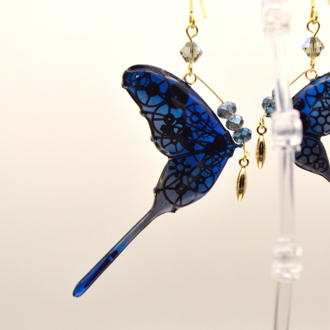 翅の中には、腕時計に使われていた本物の歯車を封入しています。